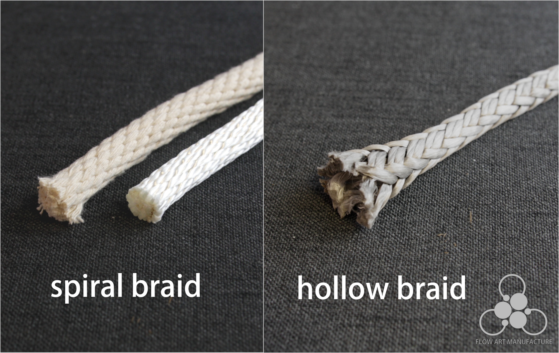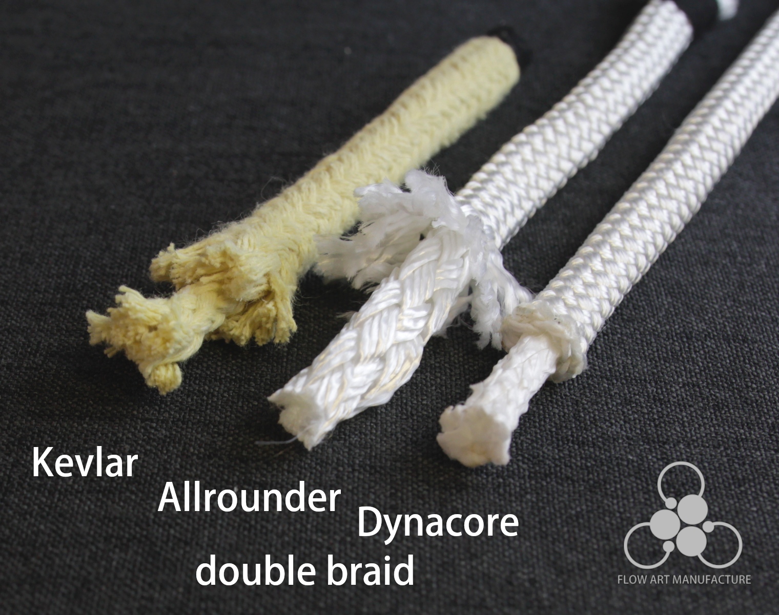 Braids are divided into two categories - with and without a core. To the ropes without core include the spiral braids and hollow braids. Spiral braids are particularly flexible and low-stretch. Hollow braids offer the great advantage that they can be spliced easily. Splicing is an elegant, knotless and particularly secure connection option. That is why hollow braids made of Technora and Dyneema are the first choice for the production of fire poi and ropedarts.